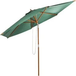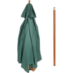 • Mit Ledertaschen an den Enden der Schirmrippen
