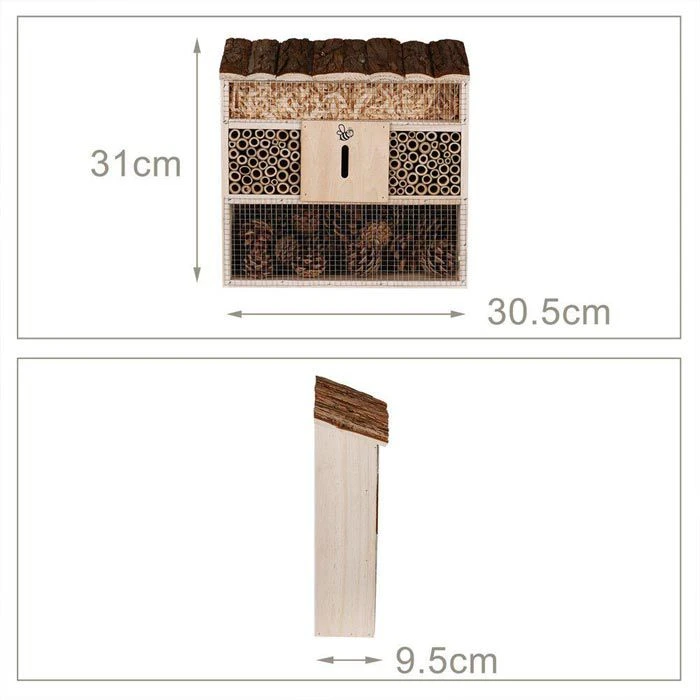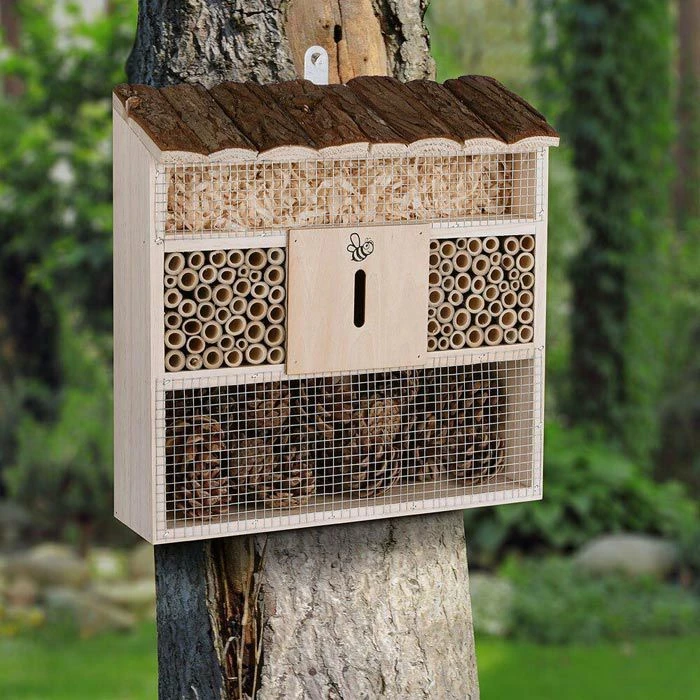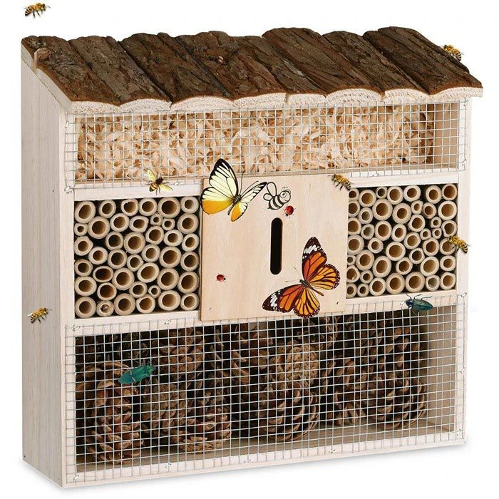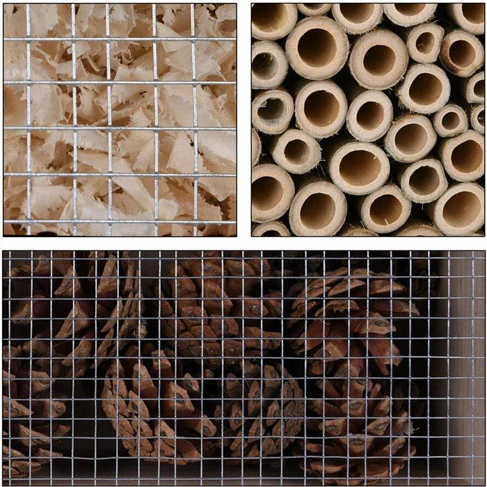 Das Insektenhotel ist eine Nist- und Überwinterungshilfe für zahlreiche Nützlinge wie z. B. Schmetterlinge, Marienkäfer, Bienen, Florfliegen u. v. m. und bietet eine hervorragende Beobachtungsmöglichkeit der Tiere in ihrem natürlichen Lebensraum. Die Insekten nisten sich im Füllmaterial ein und bekämpfen auf natürliche Weise Schädlinge und bestäuben die Blumen in Ihrem Garten.
