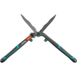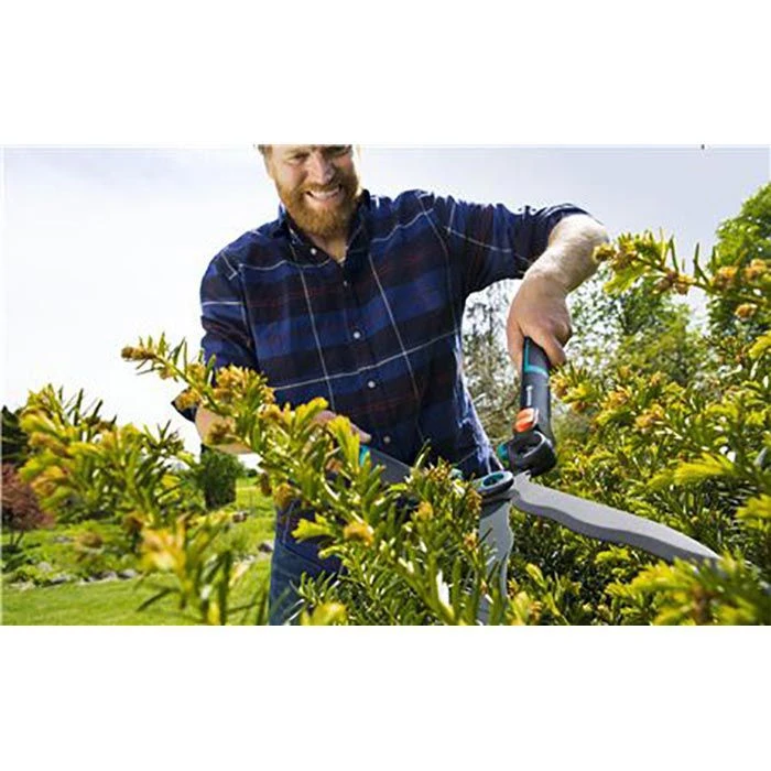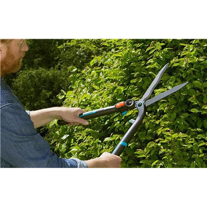 sonstiges: patentiertes 2-stufiges Getriebe mit Schnell- und Kraftschnitt, 2-in-1-Funktion für schnelles und kraftvolles Arbeiten mit hoher Effizienz, für das Schneiden von Hecken, Büschen Sträuchern und feineren Zweigen und mit Hilfe des auf Knopfdruck zuschaltbarem Getriebes auch für Äste, hierbei wird eine größere Kraft durch einen größeren Öffnungswinkel erzielt, antihaftbeschichtete Klingen mit gezahnter Kante und Wellenschliff, Handgriff rundsymmetrisch und ergonomisch geformt, mit Weichkomponente für eine gute Dämpfung