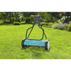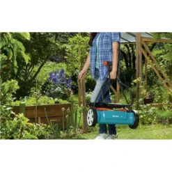 sonstiges: beim Schieben dreht sich eine mit Messern besetzte Walze an einem feststehenden Gegenmesser vorbei, dabei wird der Grashalm erfasst und sauber geschnitten, da sich Messerwalze und Untermesser nicht berühren, ist der Einsatz des Mähers besonders leise und leicht in der Handhabung, große Räder mit Spezialprofil erleichtern zusätzlich die Führung und sorgen für einen guten Griff. Gestänge kann einfach zusammengeklappt werden