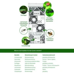 Das Insektenhotel ist eine Nist- und Überwinterungshilfe für zahlreiche Nützlinge wie z. B. Schmetterlinge, Marienkäfer, Bienen, Florfliegen u. v. m. und bietet eine hervorragende Beobachtungsmöglichkeit der Tiere in ihrem natürlichen Lebensraum. Die Insekten nisten sich im Füllmaterial ein und bekämpfen auf natürliche Weise Schädlinge und bestäuben die Blumen in Ihrem Garten.